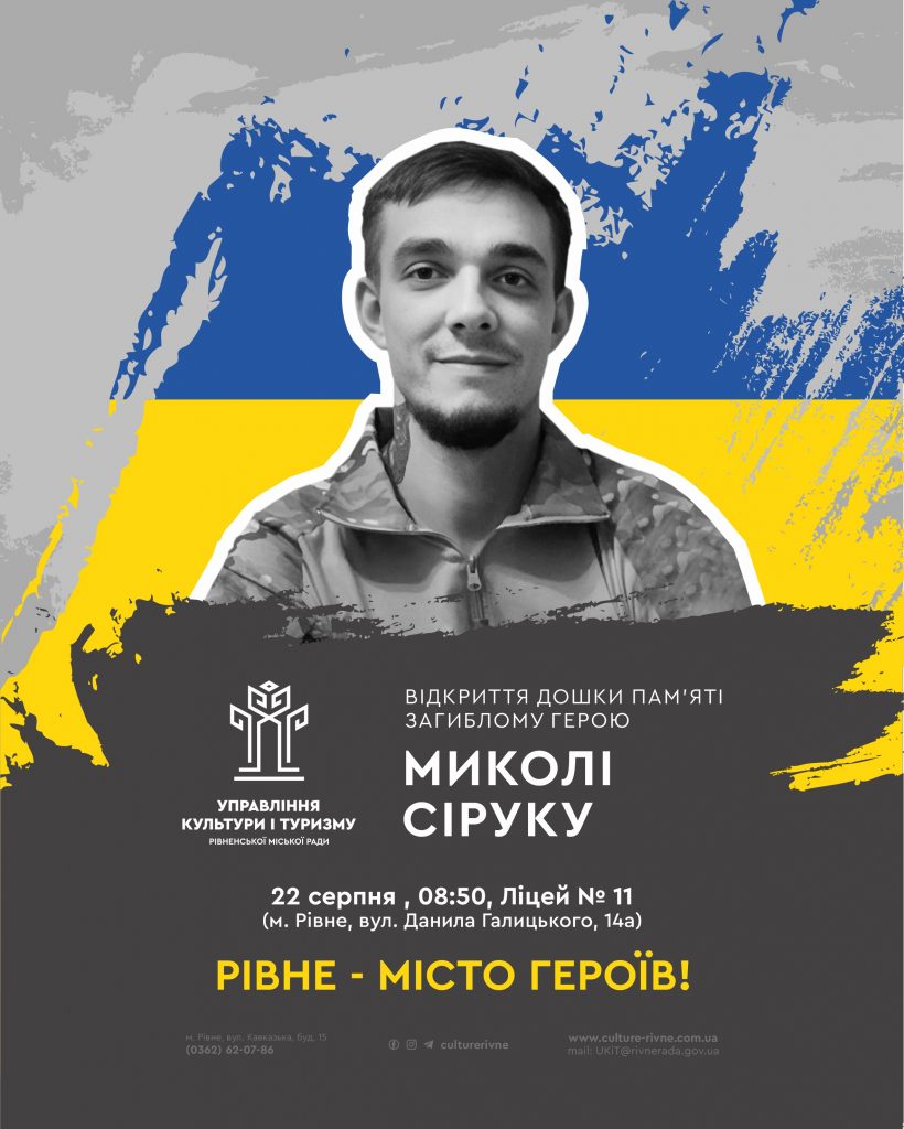 22 серпня, о 8:50, на фасаді ліцею №11 відбудеться відкриття дошки пам’яті загиблому Герою Миколі Сіруку.