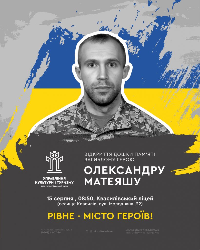 15 серпня, о 8:50, на фасаді Квасилівського ліцею відбудеться відкриття дошки пам’яті загиблому Герою Олександру Матеяшу.