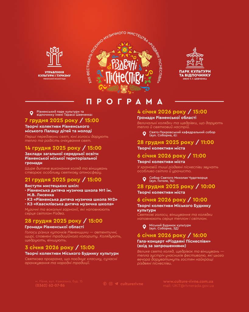 Різдво — час світла, тепла та спільної радості. У Рівному знову лунатимуть колядки, щедрівки та віншування, що об’єднують громади, мистецькі школи та творчі колективи.