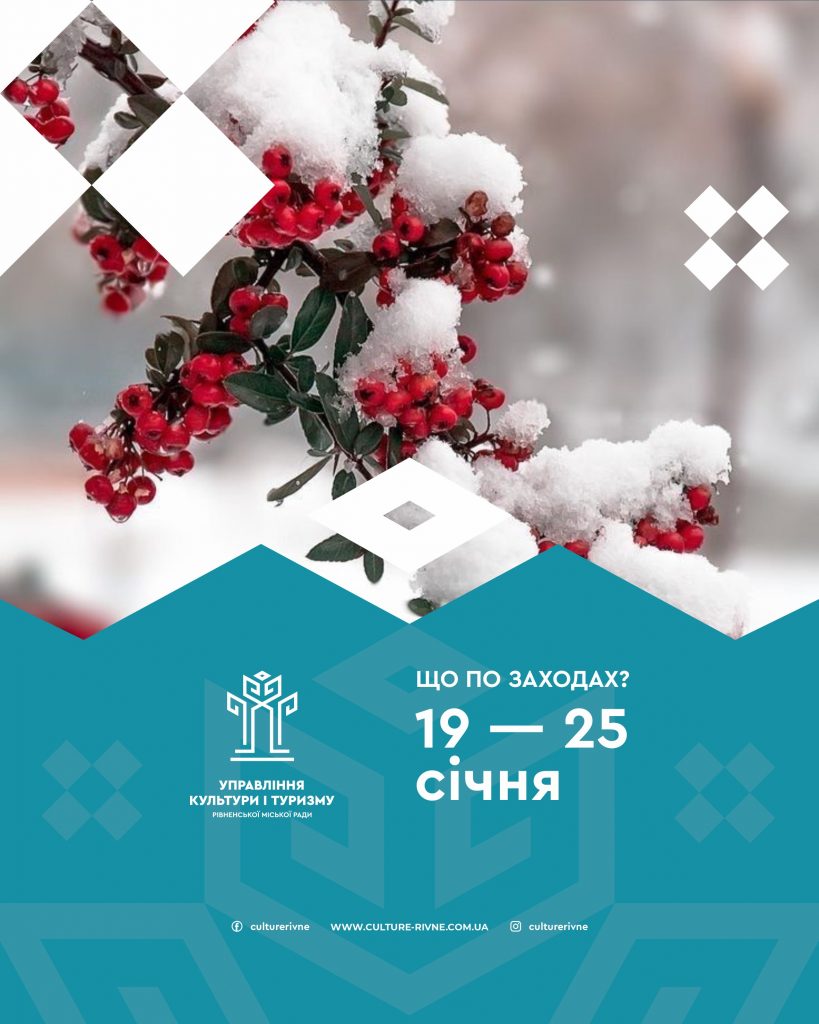 Запрошуємо рівнян та гостей міста на загальноміські заходи, які будуть відбуватися у Рівненській міській територіальній громаді на період з 19-25 січня. Протягом цього тижня на вас чекає безліч цікавих подій, заходів, майстер-класів, виставок, тощо. Бажаємо аби цей робочий тиждень у вас пройшов яскраво і впевнені, що з цим допоможуть наші загальноміські заходи.