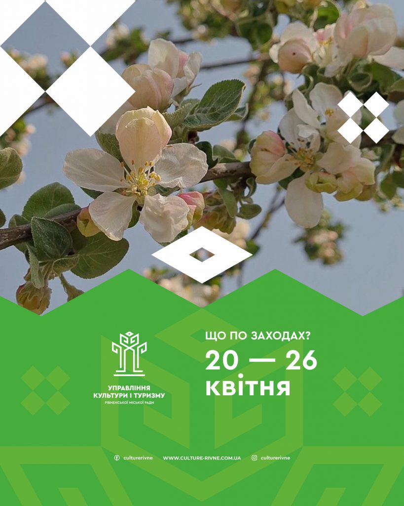 Запрошуємо рівнян та гостей міста на загальноміські заходи, які будуть відбуватися у Рівненській міській територіальній громаді на період з 20-26 квітня. Протягом цього тижня на вас чекає безліч цікавих подій, заходів, майстер-класів, виставок, тощо. Бажаємо аби цей робочий тиждень у вас пройшов яскраво і впевнені, що з цим допоможуть наші загальноміські заходи.