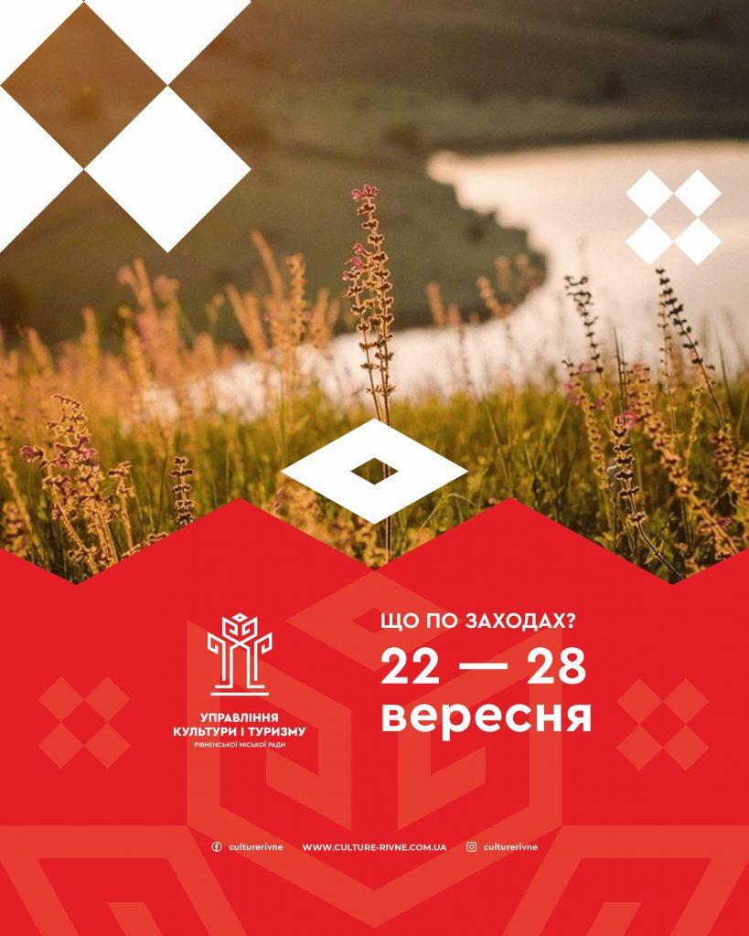 Запрошуємо рівнян та гостей міста на загальноміські заходи, які будуть відбуватися у Рівненській міській територіальній громаді на період з 22 – 28 вересня. Протягом цього тижня на вас чекає безліч цікавих подій, заходів, майстер-класів, виставок, тощо. Бажаємо аби цей робочий тиждень у вас пройшов яскраво і впевнені, що з цим допоможуть наші загальноміські заходи.
