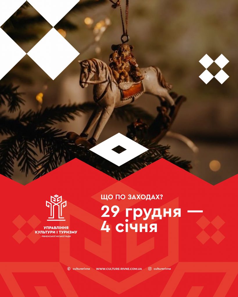 Запрошуємо рівнян та гостей міста на загальноміські заходи, які будуть відбуватися у Рівненській міській територіальній громаді на період з 29 грудня-4 січня. Протягом цього тижня на вас чекає безліч цікавих подій, заходів, майстер-класів, виставок, тощо. Бажаємо аби цей робочий тиждень у вас пройшов яскраво і впевнені, що з цим допоможуть наші загальноміські заходи.