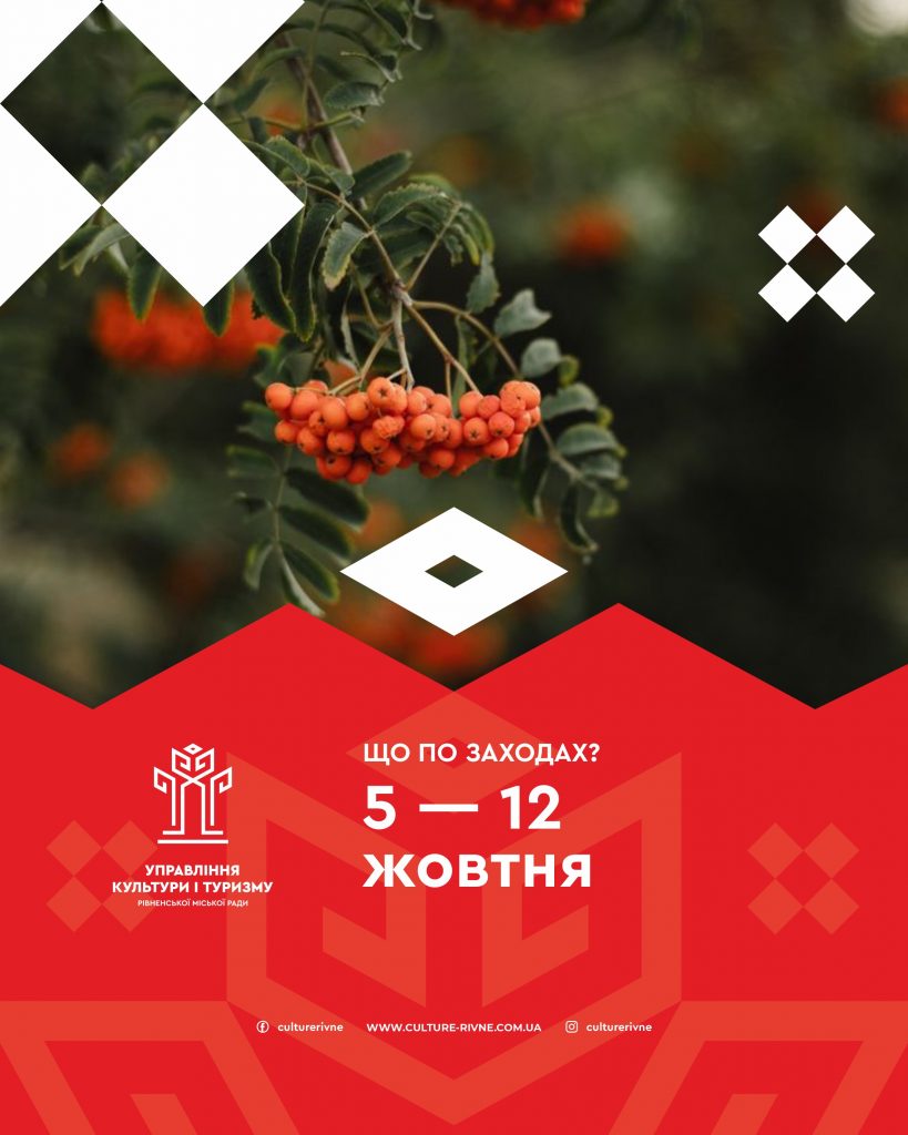 Запрошуємо рівнян та гостей міста на загальноміські заходи, які будуть відбуватися у Рівненській міській територіальній громаді на період з 6 – 12 жовтня. Протягом цього тижня на вас чекає безліч цікавих подій, заходів, майстер-класів, виставок, тощо. Бажаємо аби цей робочий тиждень у вас пройшов яскраво і впевнені, що з цим допоможуть наші загальноміські заходи.